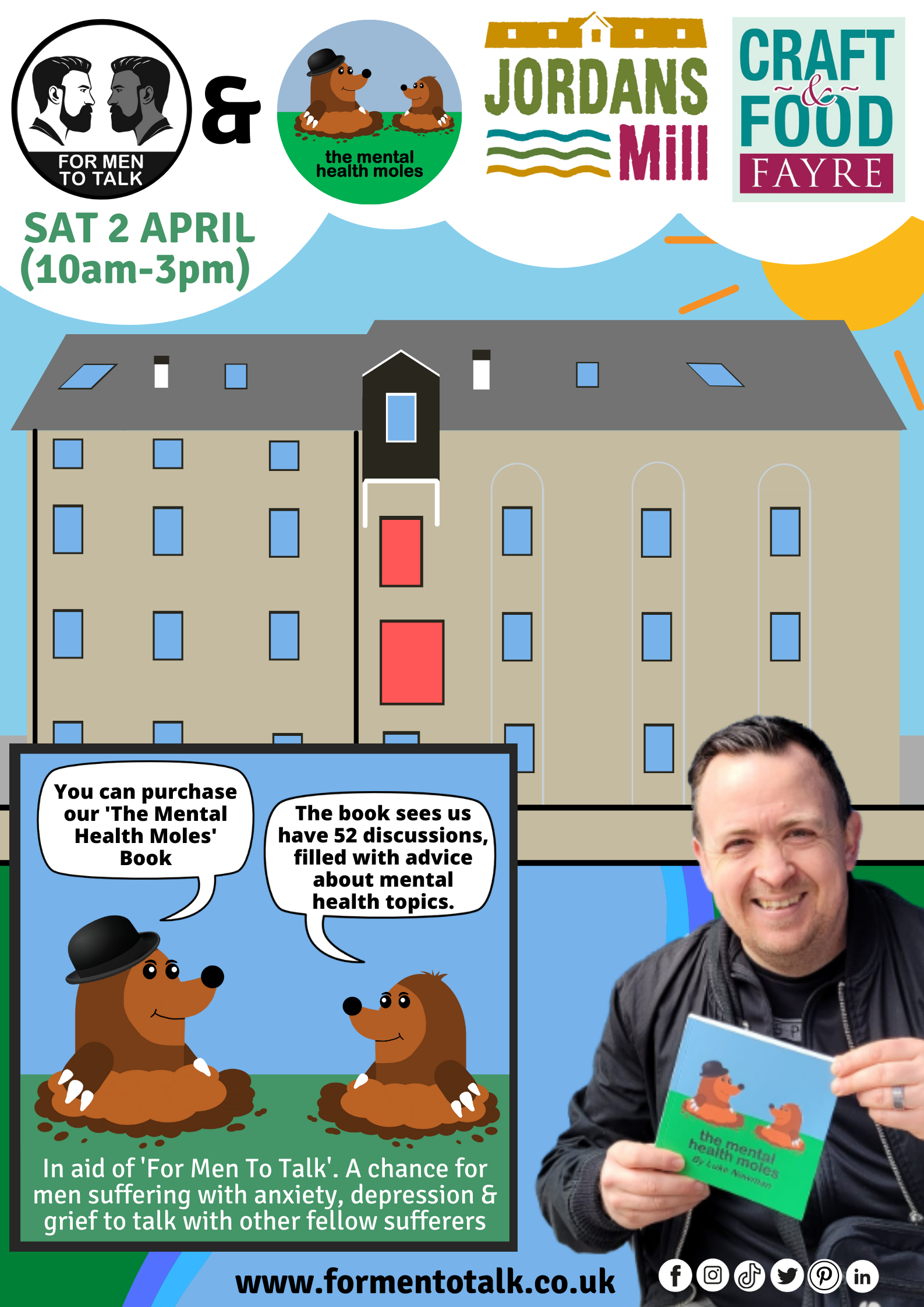 For Men To Talk & The Mental Health Moles will be at Jordans Mill – Monthly Craft & Food Fayre on Saturday 2 April 2022, from 10am until 3pm