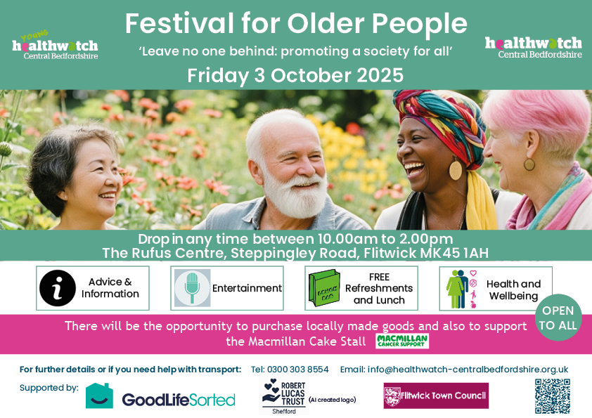 We’re proud to be hosting a Macmillan Coffee Morning as part of the Healthwatch Festival for Older People on 3rd October 2025 at The Rufus Centre, Flitwick! Come along for cake, community, and conversation—all while raising money for people living with cancer.